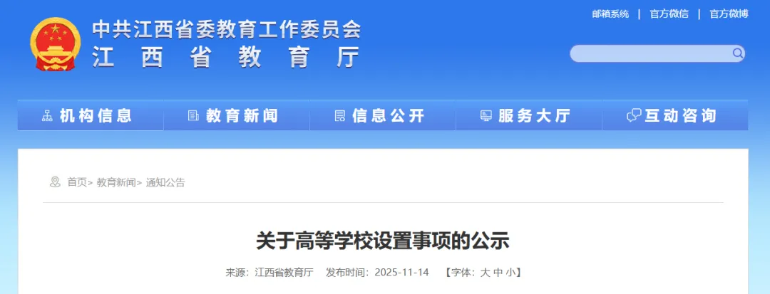 11月14日,江西省教育廳發(fā)布《關(guān)于高等學(xué)校設(shè)置事項(xiàng)的公示》。