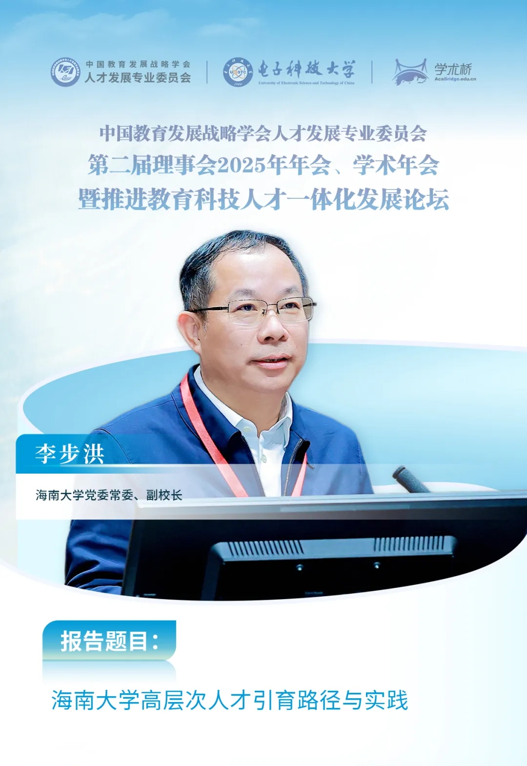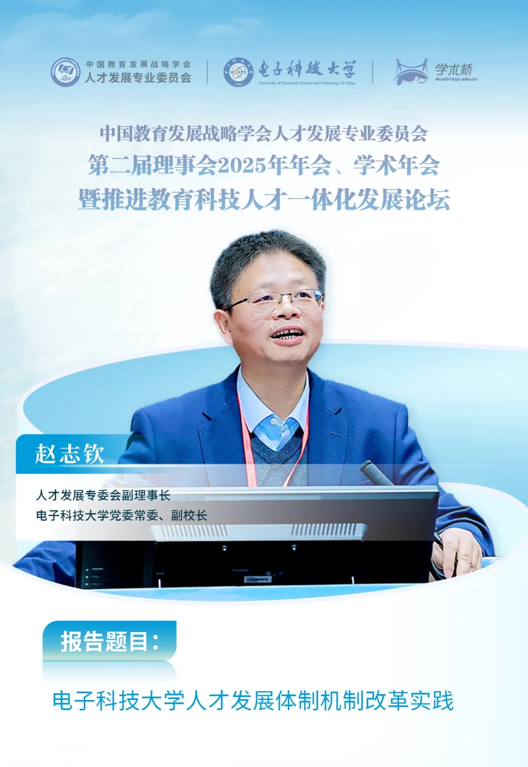 中國教育發(fā)展戰(zhàn)略學(xué)會常務(wù)副會長兼人才發(fā)展專委會理事長李志民,四川省人力資源和社會保障廳黨組成員、副廳長、一級巡視員董宏杰,電子科技大學(xué)黨委常委、副校長趙志欽等領(lǐng)導(dǎo)出席開幕式并致辭。