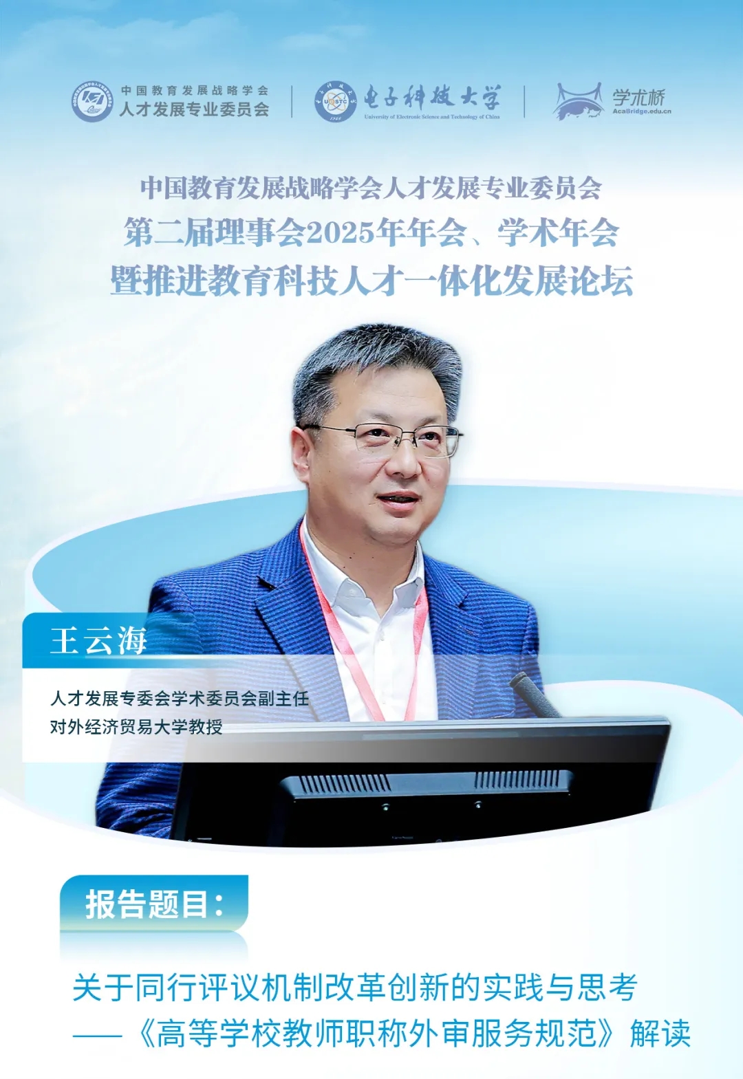 王云海分享了對同行評議機制改革創(chuàng)新的實踐探索與思考,重點對中國教育發(fā)展戰(zhàn)略學(xué)會新近發(fā)布的《高等學(xué)校教師職稱外審服務(wù)規(guī)范》團體標(biāo)準(zhǔn)進行了解讀。他說,該項標(biāo)準(zhǔn)是人才發(fā)展專委會落實教育部和中國教育發(fā)展戰(zhàn)略學(xué)會推進教育標(biāo)準(zhǔn)化工作的具體舉措,是聚焦同行評議機制和代表性成果評價制度改革創(chuàng)新的實踐探索。對高校教師職稱外審工作中的專家?guī)旖ㄔO(shè)、專家匹配和遴選、代表性成果分類、外審服務(wù)流程等工作進行規(guī)范,希望能為高校教師職稱外審工作提供規(guī)范化指引。標(biāo)準(zhǔn)的發(fā)布實施將有效提升人才評價質(zhì)量,對推動教育評價改革,構(gòu)建科學(xué)、公正的高校人才評價體系具有重要意義。