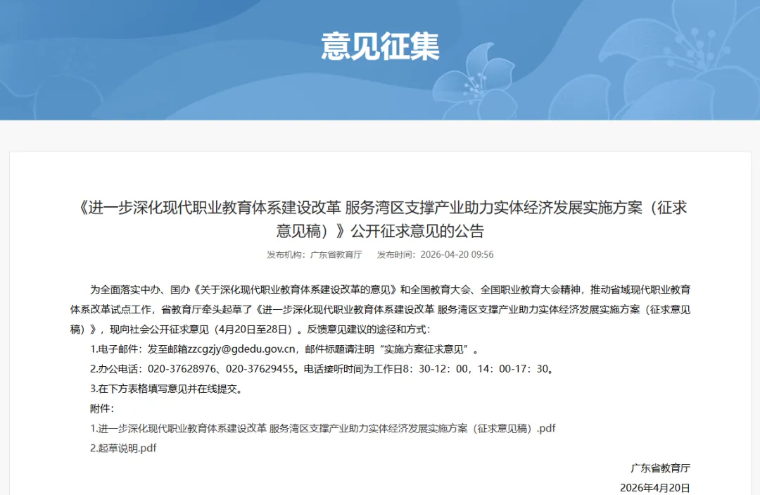 近日,廣東省教育廳牽頭起草了《進(jìn)一步深化現(xiàn)代職業(yè)教育體系建設(shè)改革 服務(wù)灣區(qū)支撐產(chǎn)業(yè)助力實(shí)體經(jīng)濟(jì)發(fā)展實(shí)施方案(征求意見(jiàn)稿)》(以下簡(jiǎn)稱(chēng)《征求意見(jiàn)稿》)。