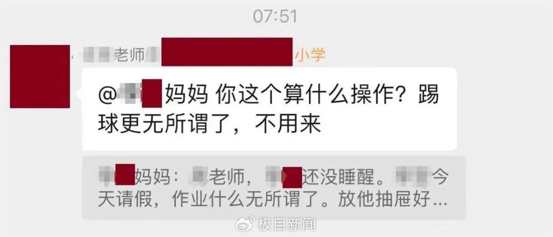 隨后這位家長直接說孩子沒有醒,今天上午不去了。并強調,“作業(yè)寫不寫,我們自己做主”。并詢問,“如果下午踢球,我送孩子來踢球”。