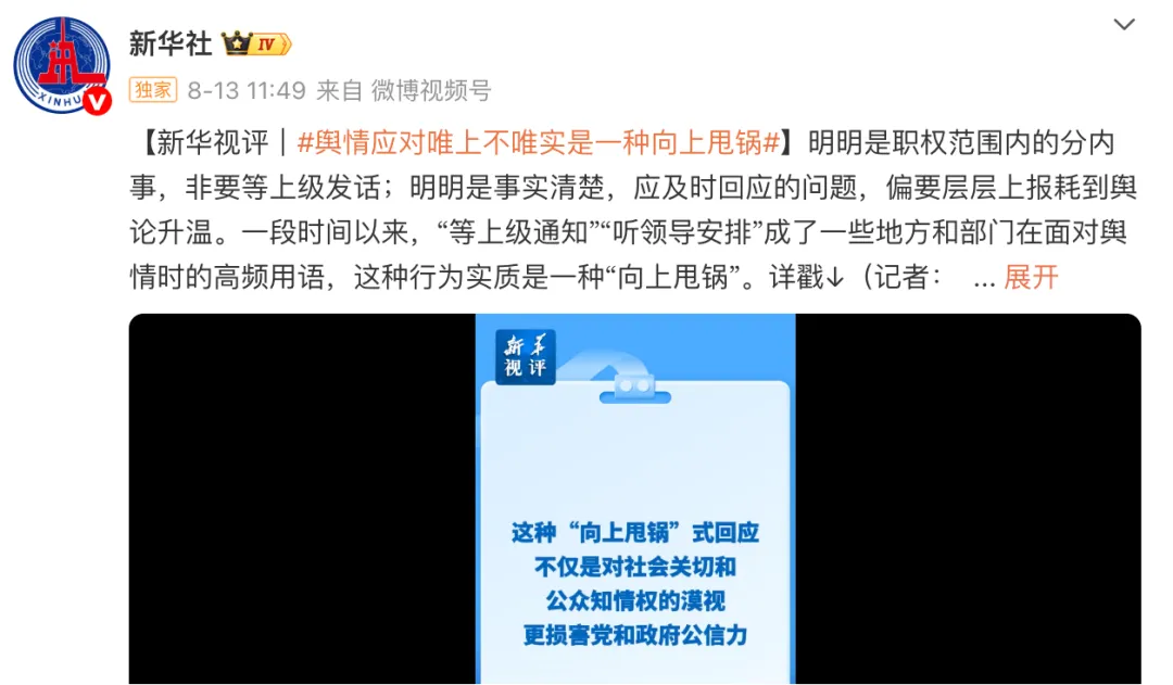 新華社最近發(fā)布評(píng)論,公開(kāi)批評(píng)在輿情處置上“等上級(jí)指示”等不唯實(shí),只唯上的“向上甩鍋”式的輿情回應(yīng):不僅是對(duì)社會(huì)關(guān)切和公眾知情權(quán)的漠視,更損害黨和政府的公信力!