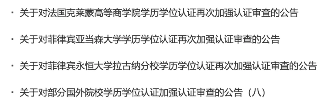 其中一個(gè)重要措施就是對(duì)海外“水文憑”的認(rèn)證治理。從2021年至今,教育部留學(xué)服務(wù)中心先后發(fā)布了8次加強(qiáng)認(rèn)證的通告,對(duì)存在濫發(fā)文憑嫌疑的海外高校增加認(rèn)證環(huán)節(jié),延長(zhǎng)認(rèn)證周期。這8次通告共涉及幾十所海外高校,主要是來(lái)自菲律賓等東南亞國(guó)家與個(gè)別歐洲國(guó)家,其中菲律賓私立高校高居榜首,18所私立高校被警示“加強(qiáng)認(rèn)證”,其中菲律賓永恒大學(xué)與亞當(dāng)森大學(xué)均是二次上榜,可以說(shuō)是“慣犯”。