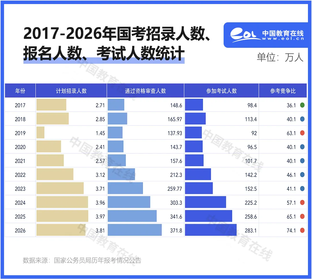 11月30日,2026年公務(wù)員國考開考,通過資格審查的報名人數(shù)371.8萬人(實(shí)際參考人數(shù)為283.1萬人),共計(jì)劃招錄3.81萬人,比去年減少0.16萬人,錄取比74:1,比去年的65:1有明顯增長。