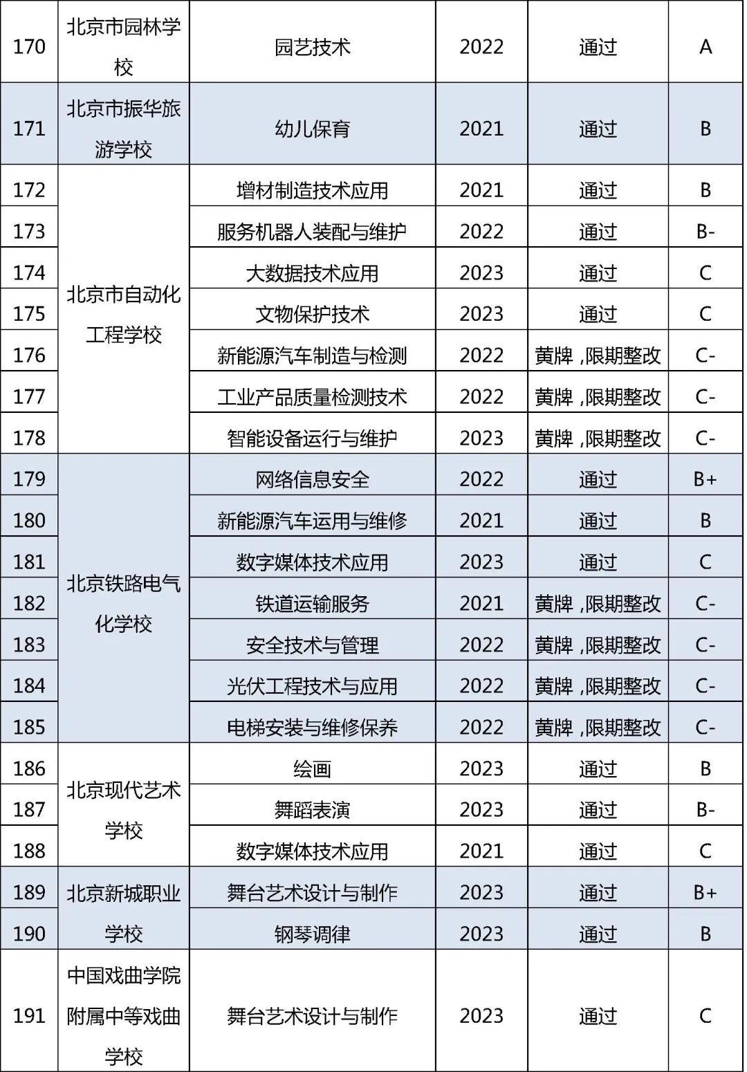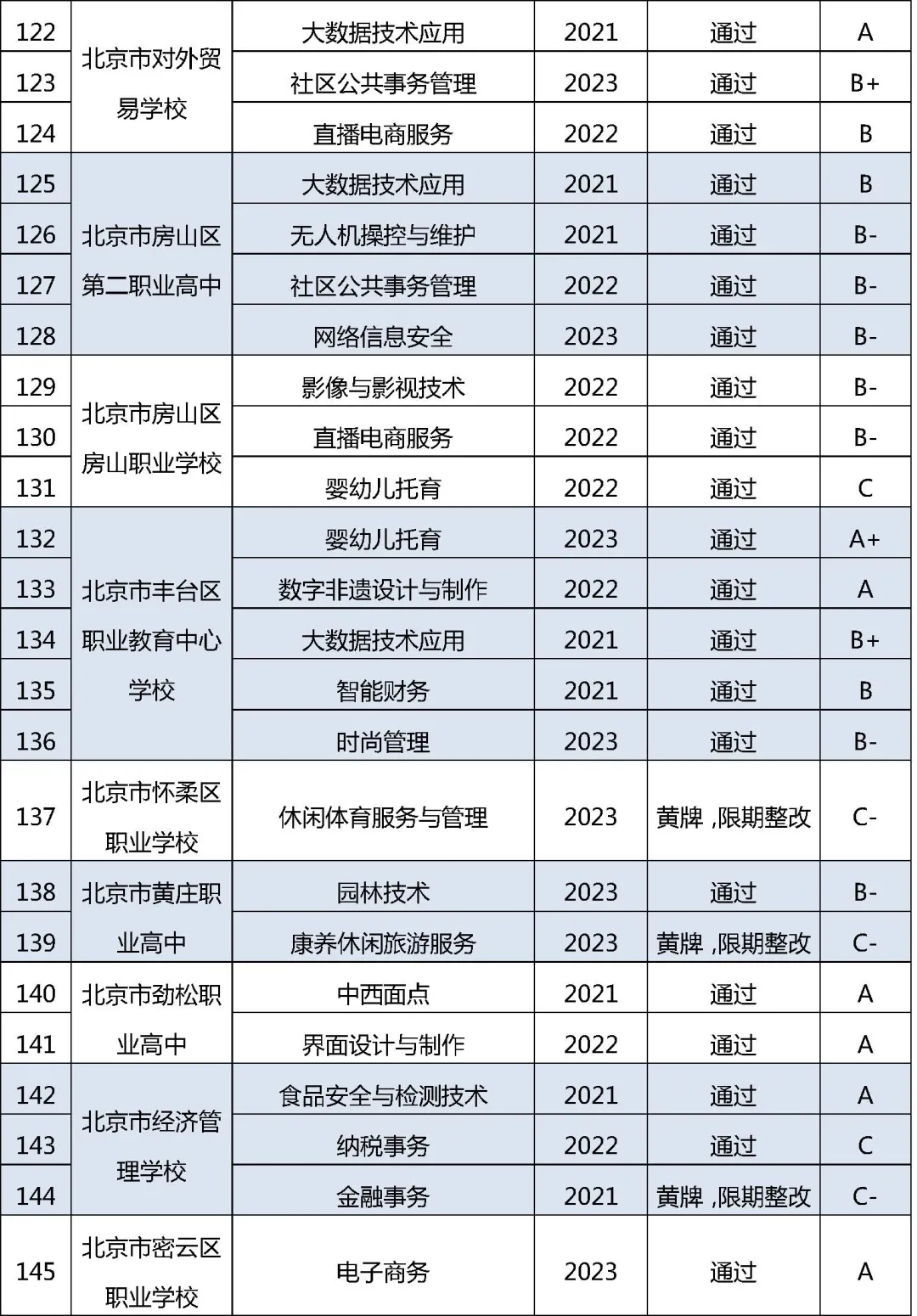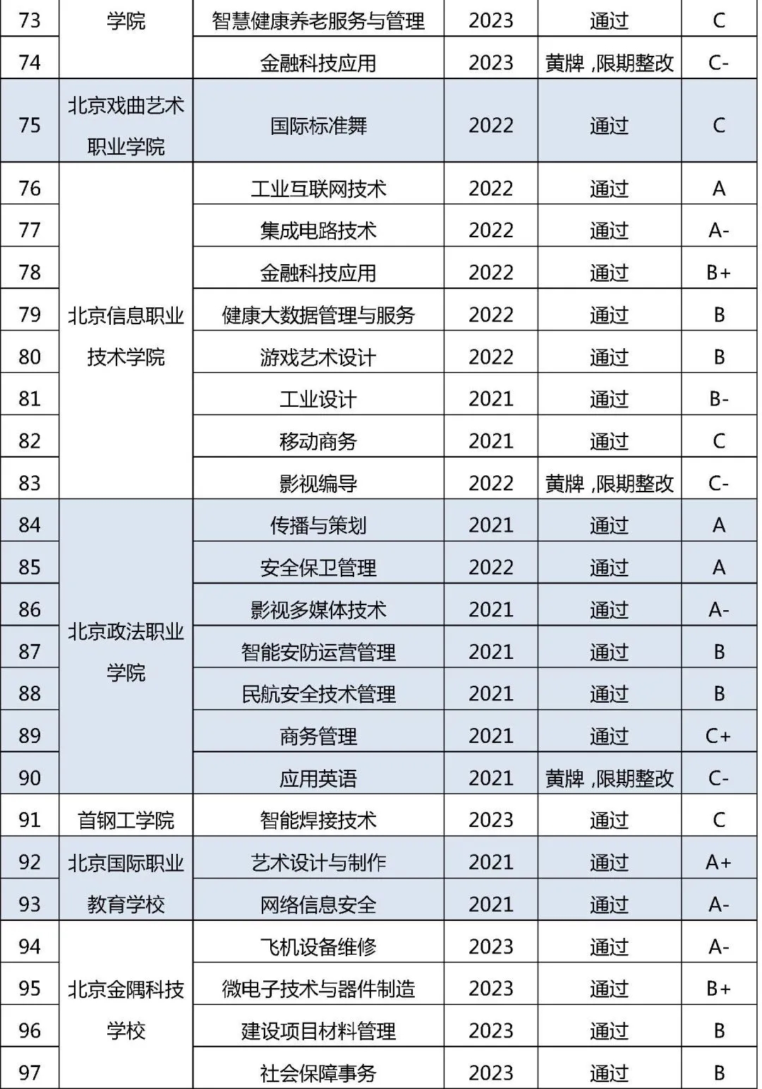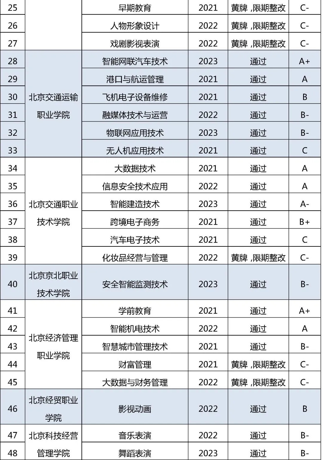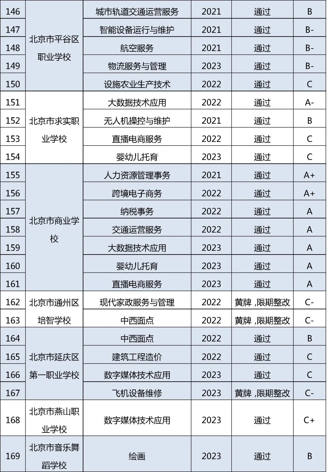 近日,2024年北京市職業(yè)院校近三年新增專(zhuān)業(yè)質(zhì)量監(jiān)測(cè)評(píng)價(jià)結(jié)果公布。評(píng)價(jià)結(jié)果顯示,36所職校163個(gè)專(zhuān)業(yè)予以通過(guò),17所職校的28個(gè)專(zhuān)業(yè)給予“黃牌、限期整改”,要求限期整改。其中,9所高職的13個(gè)專(zhuān)業(yè)為“黃牌、限期整改”。