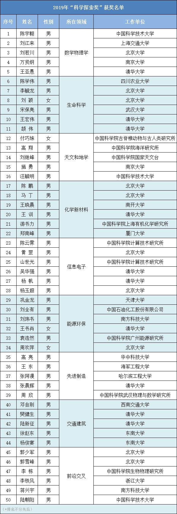 2019年度“科學(xué)探索獎(jiǎng)”獲獎(jiǎng)人來(lái)自全國(guó)11個(gè)省市的26個(gè)科研單位、高校和企業(yè)。為了選拔和激勵(lì)更多青年科技工作者,經(jīng)過(guò)評(píng)審委員會(huì)決定,在獎(jiǎng)項(xiàng)評(píng)審中采用“新星機(jī)制”——在同等申報(bào)條件下,年紀(jì)更輕者勝出。最終50位獲獎(jiǎng)人中,35歲及以下獲獎(jiǎng)人有9位,比例接近20%,充分體現(xiàn)了該獎(jiǎng)項(xiàng)激勵(lì)青年科技工作者的初衷。