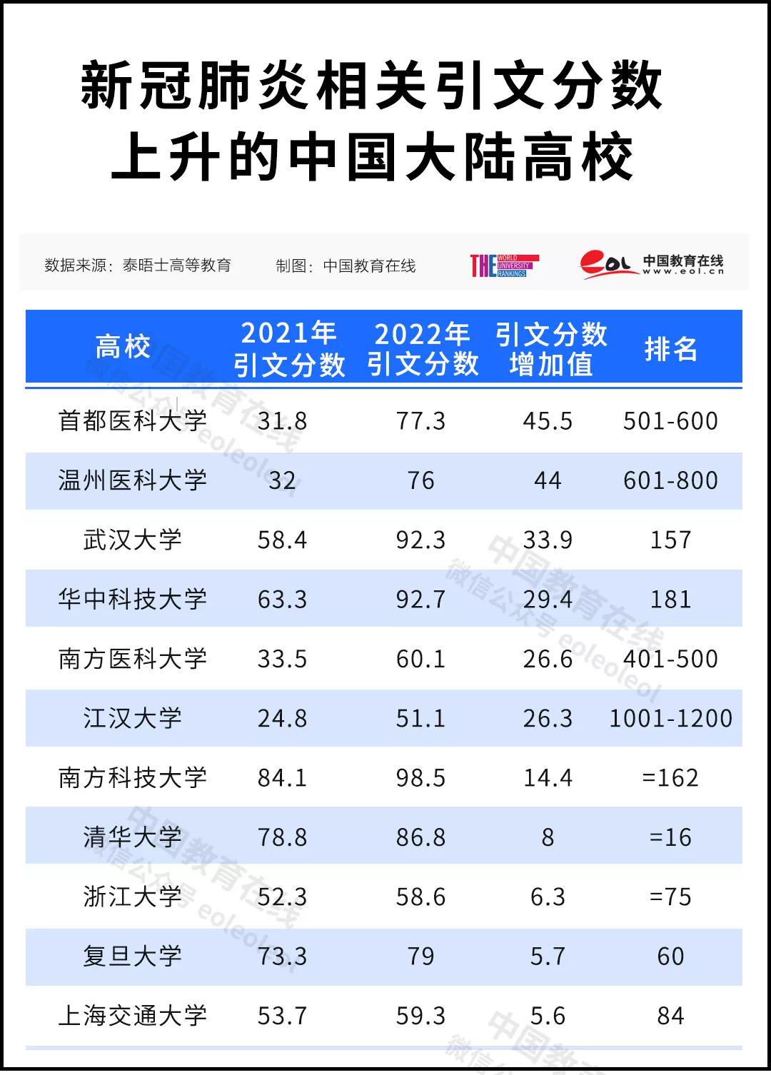 中國大陸 11 所高校的引文分數出現了提升,華中科技大學(第 181 名)、南方醫(yī)科大學(第 401-500 名)、首都醫(yī)科大學(第 501-600 名)和溫州醫(yī)科大學(第 601-800 名)的排名均至少上升了兩個區(qū)間。