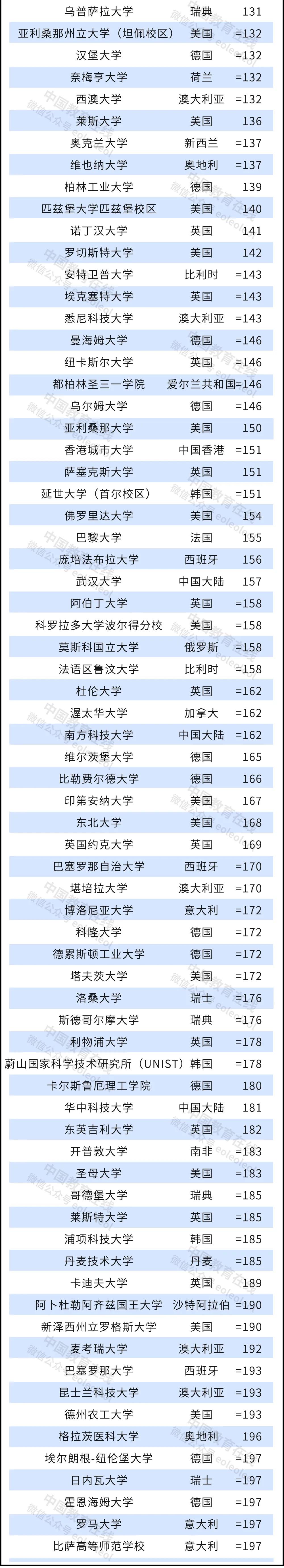 武漢大學(第 157 名)、南方科技大學(第 162名)和華中科技大學(第 181 名)為首次進入前200名的高校。