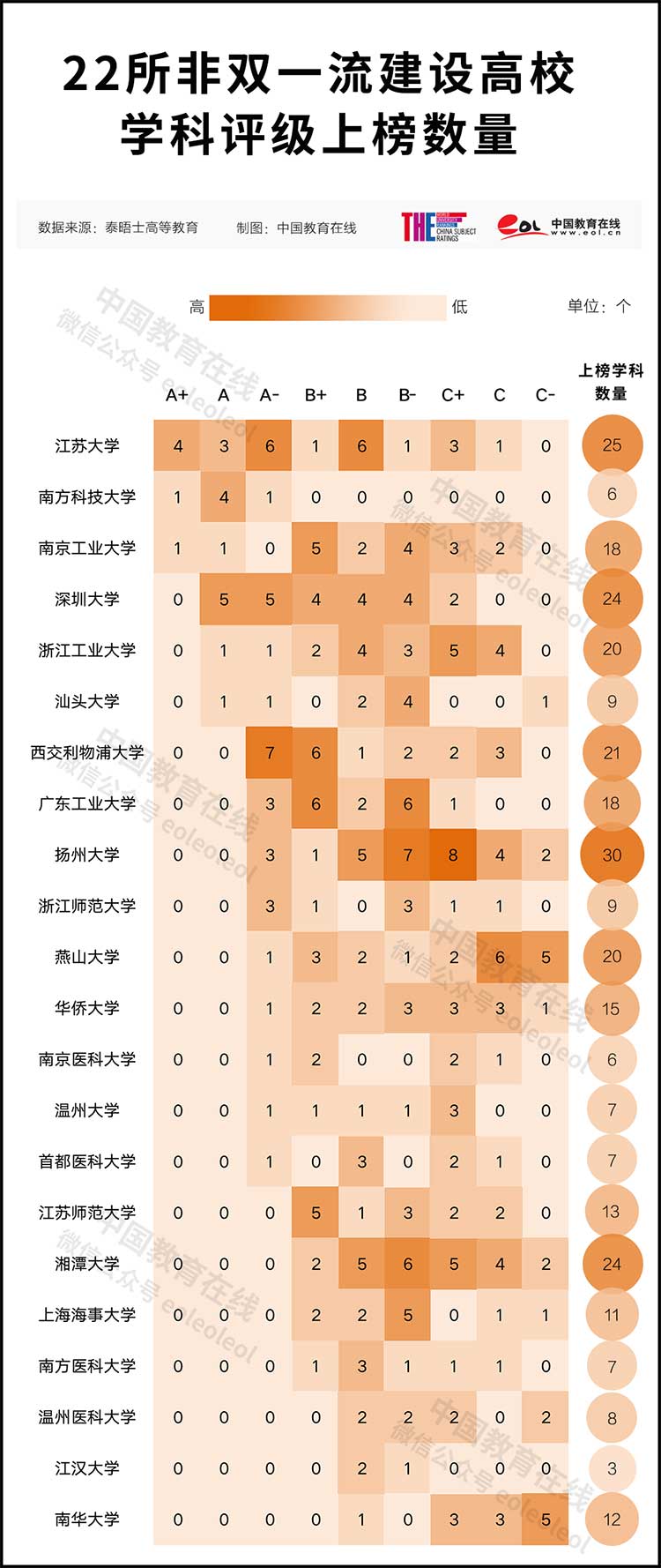 值得一提的是,本次有22所非“雙一流”高校參與學(xué)科評級,其中,揚州大學(xué)上榜學(xué)科數(shù)量最多,達30個。江蘇大學(xué)上榜學(xué)科總數(shù)其次,有25個,且多集中于A類,13個A類學(xué)科中有4個A+學(xué)科,在非“雙一流”高校中表現(xiàn)不俗。南方科技大學(xué)、南京工業(yè)大學(xué)也分別有1個學(xué)科入選A+。