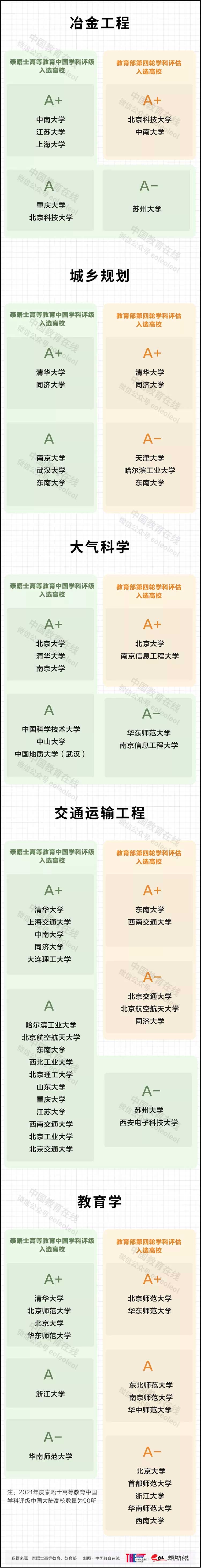 評級結(jié)果還表明,中國大陸高校在五個學(xué)科取得了成功:冶金工程(A)、城鄉(xiāng)規(guī)劃(A)、大氣科學(xué)(A-)、交通工程(A-)和教育學(xué)(A-)的評級均優(yōu)于英國、美國、加拿大、澳大利亞和德國。
