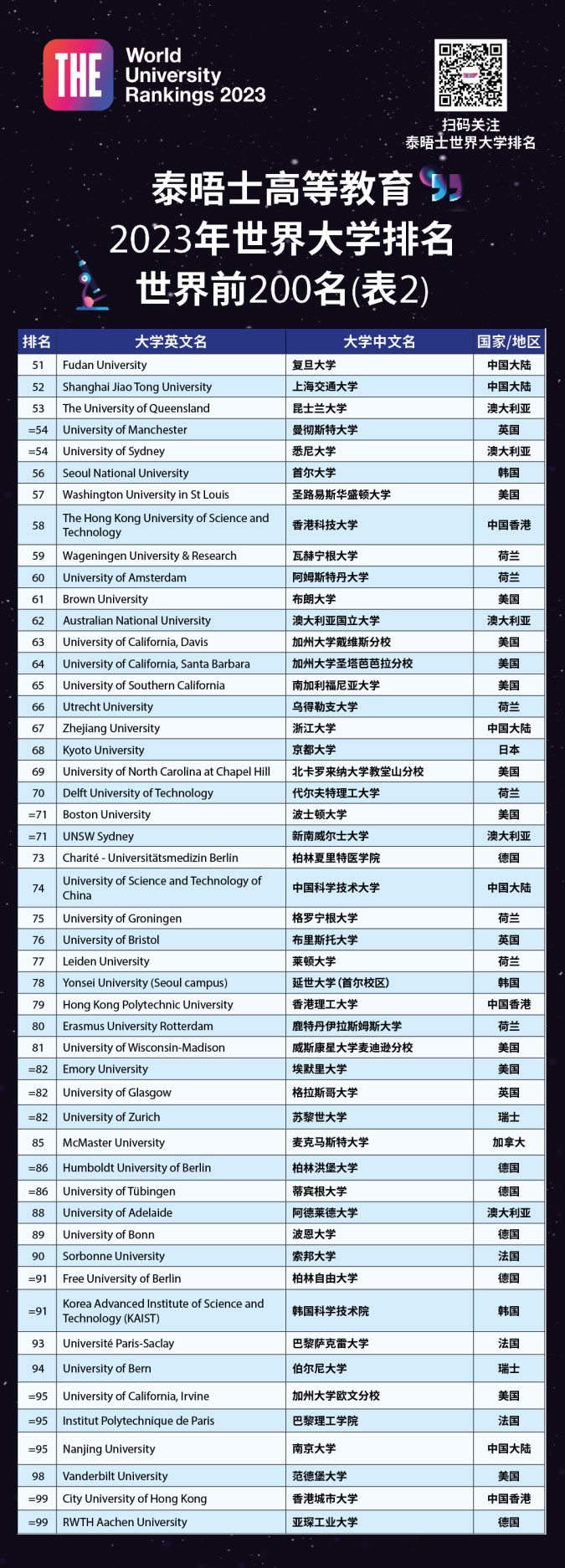 復(fù)旦大學(xué)(第51位)以及上海交通大學(xué)(第52位)排名均有所上升,進(jìn)一步逼近世界50強(qiáng)。