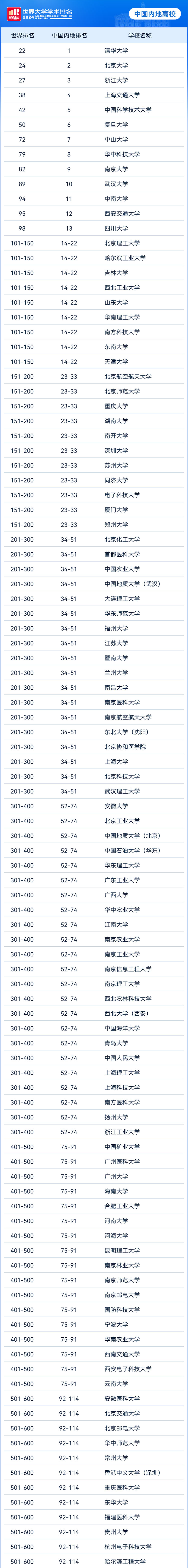 清華大學(xué)排名最高,保持全球第22名。北京大學(xué)排名上升5名,位列全球第24。浙江大學(xué)排名上升6名,位列全球第27,上海交通大學(xué)排名上升8名,位列第38。中國科學(xué)技術(shù)大學(xué)(42名)、復(fù)旦大學(xué)(50名)首次躋身全球50強(qiáng),中山大學(xué)(72名)、華中科技大學(xué)(79名)、南京大學(xué)(82名)和中南大學(xué)(94名)保持在全球百強(qiáng)。