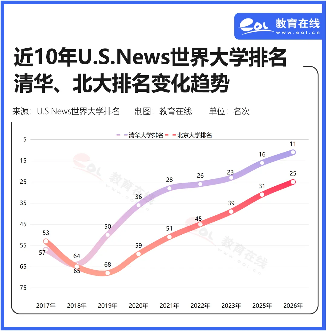 縱觀四個世界大學(xué)排行榜近10年的排名數(shù)據(jù),中國頂尖高校表現(xiàn)為加速上升趨勢,已進入全球前列。比如,清華大學(xué)軟科排名從2016年的第58位升至2025年的第18位,北京大學(xué)從2016年的排名世界第71位到2025年升至排名世界第23位。清華大學(xué)在四大世界排名中的最高名次是2026年U.S.News排名中位列世界第11位,北京大學(xué)近年來的最高名次是在2026年泰晤士世界大學(xué)排名中位列世界第13位,均已進入全球20強行列。