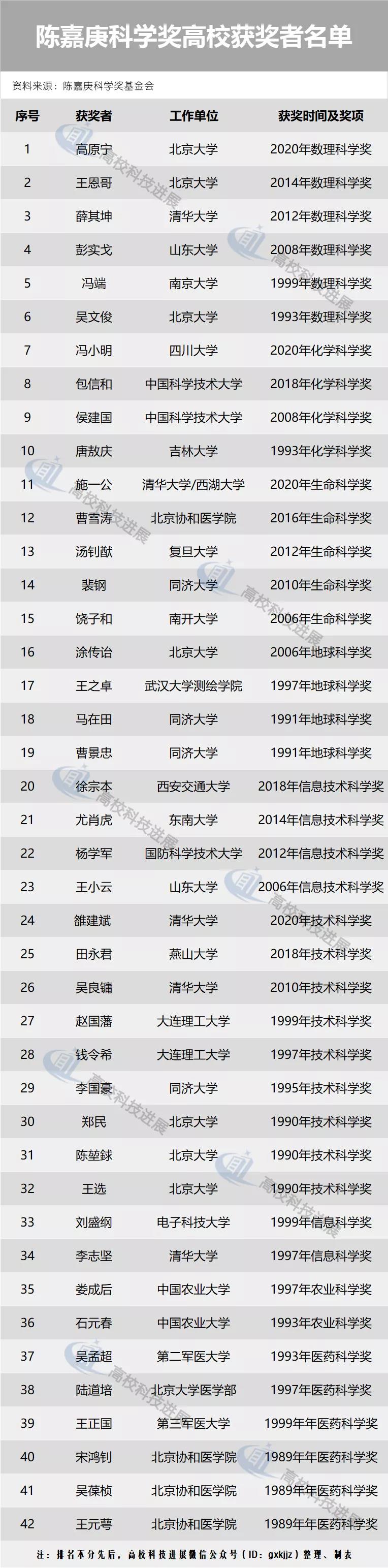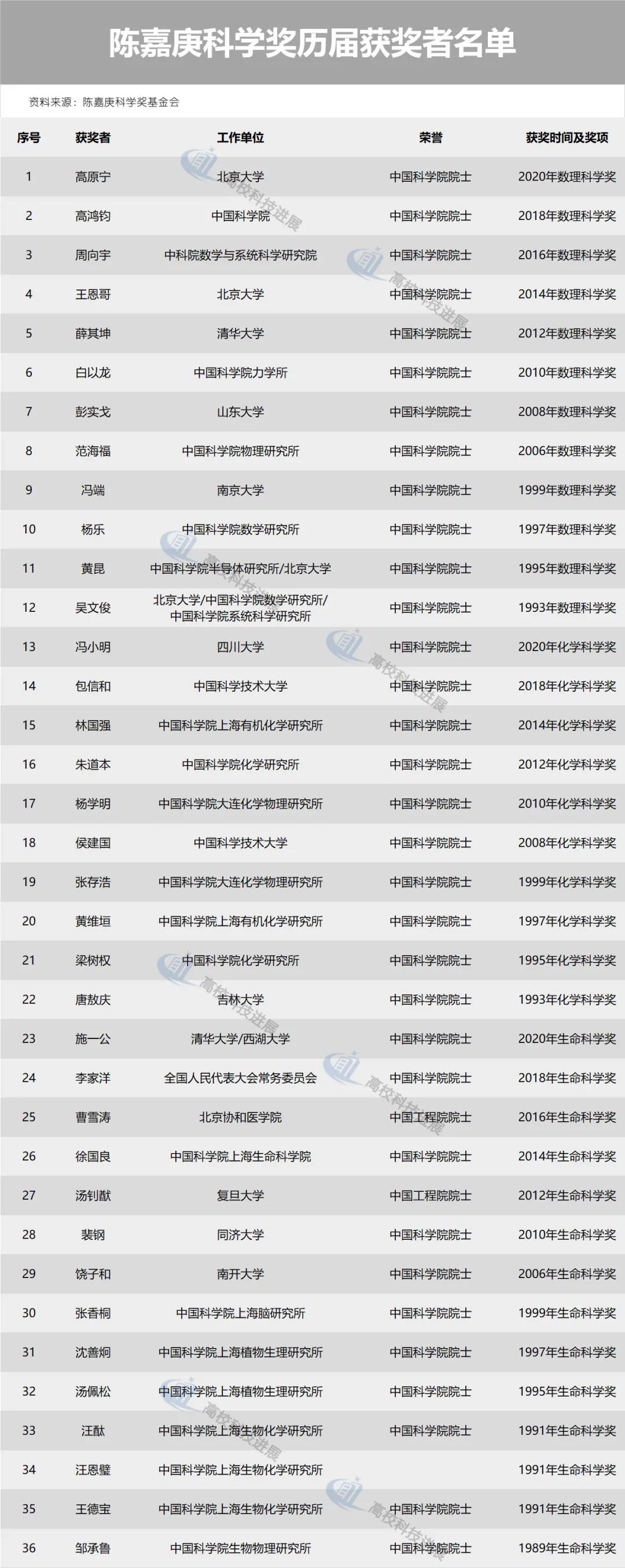 根據(jù)《陳嘉庚科學(xué)獎基金會關(guān)于2020年度陳嘉庚科學(xué)獎和陳嘉庚青年科學(xué)獎獎勵的決定》,共有5位科學(xué)家獲得陳嘉庚科學(xué)獎,6位青年才俊獲得陳嘉庚青年科學(xué)獎。