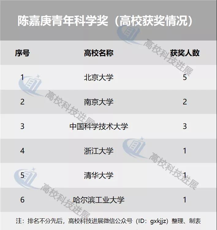 陳嘉庚青年科學(xué)獎:北京大學(xué)共有3位青年才俊獲得陳嘉庚青年科學(xué)獎的數(shù)理科學(xué)獎、化學(xué)科學(xué)獎、信息技術(shù)科學(xué)獎,南京大學(xué)有1位青年才俊獲得陳嘉庚青年科學(xué)獎地球科學(xué)獎。