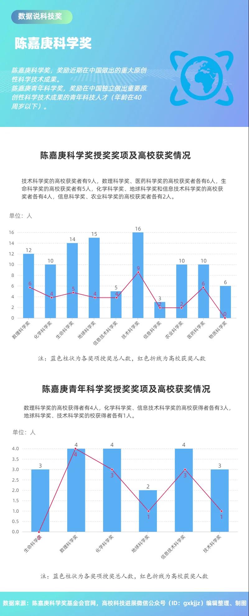 陳嘉庚科學(xué)獎中,技術(shù)科學(xué)獎的高校獲獎?wù)哂?人,數(shù)理科學(xué)獎、醫(yī)藥科學(xué)獎的高校獲獎?wù)吒饔?人,生命科學(xué)獎的高校獲獎?wù)哂?人,化學(xué)科學(xué)獎、地球科學(xué)獎和信息技術(shù)科學(xué)獎的高校獲獎?wù)吒饔?人,信息科學(xué)獎、農(nóng)業(yè)科學(xué)獎的高校獲獎?wù)吒饔?人。