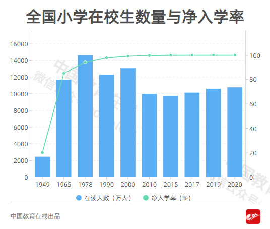 小學(xué)從建國(guó)時(shí)期入學(xué)率20%到2020年達(dá)到99.96%