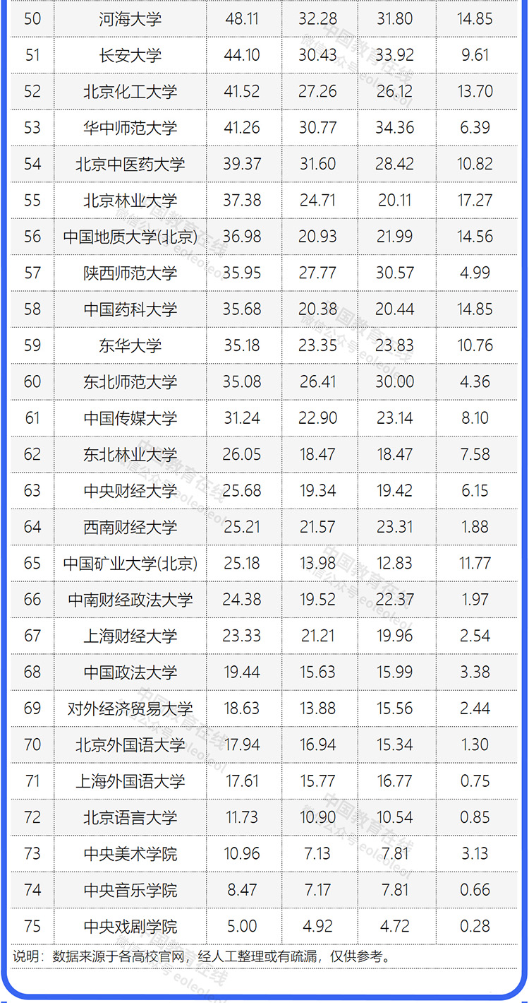 說(shuō)明:本文統(tǒng)計(jì)中,華北電力大學(xué)經(jīng)費(fèi)為北京校區(qū)和保定校區(qū)合計(jì),哈爾濱工業(yè)大學(xué)、北京航空航天大學(xué)、西北工業(yè)大學(xué)等工信部直屬高校以及國(guó)科大、中科大等中國(guó)科學(xué)院直屬高校以及其他部委院校不在本文的統(tǒng)計(jì)范圍之內(nèi)。