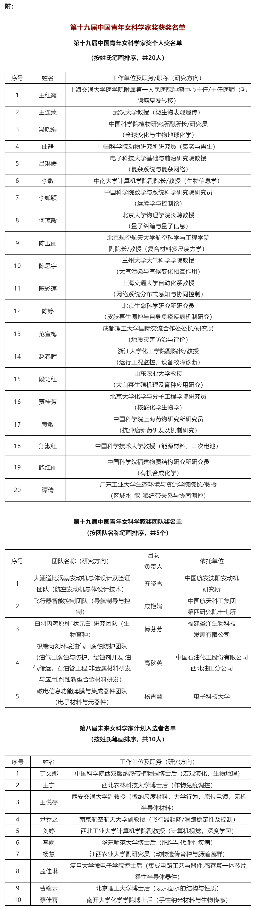 經(jīng)第十九屆中國青年女科學(xué)家獎(jiǎng)評(píng)審委員會(huì)評(píng)審,上海交通大學(xué)醫(yī)學(xué)院附屬第一人民醫(yī)院腫瘤中心主任、主任醫(yī)師王紅霞等20名女科學(xué)家獲得第十九屆中國青年女科學(xué)家獎(jiǎng);大涵道比渦扇發(fā)動(dòng)機(jī)總體設(shè)計(jì)及驗(yàn)證團(tuán)隊(duì)等5個(gè)團(tuán)隊(duì)獲得第十九屆中國青年女科學(xué)家獎(jiǎng)團(tuán)隊(duì)獎(jiǎng);中國科學(xué)院西雙版納熱帶植物園在站博士后丁文娜等10人入選第八屆未來女科學(xué)家計(jì)劃。