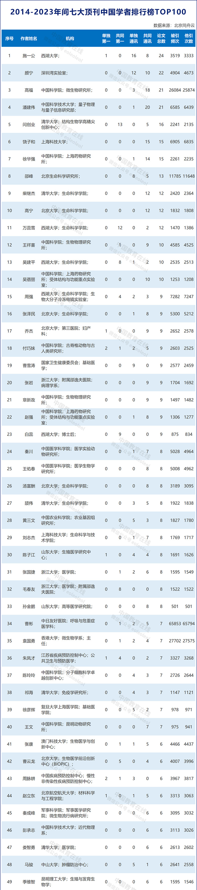 在科學(xué)界,Cell、Nature、Science(CNS)被廣泛認(rèn)可為頂級(jí)期刊。在醫(yī)學(xué)領(lǐng)域,新英格蘭醫(yī)學(xué)雜志(NEJM)、柳葉刀(Lancet)、美國(guó)醫(yī)學(xué)會(huì)雜志(JAMA)和英國(guó)醫(yī)學(xué)期刊(BMJ)被稱為“四大頂級(jí)醫(yī)學(xué)期刊”。在這七種期刊上發(fā)表論文通常被視為學(xué)術(shù)評(píng)價(jià)的重要標(biāo)志。北京同舟云使用全球?qū)W者庫(kù)規(guī)范化處理的學(xué)者及機(jī)構(gòu)數(shù)據(jù),對(duì)2014-2023年七大頂刊上出版的全部論文進(jìn)行了統(tǒng)計(jì)分析,得到結(jié)果如下:2014年至2023年期間,CNS共發(fā)表了21661篇論文,其中由中國(guó)學(xué)者為第一作者機(jī)構(gòu)發(fā)布的論文數(shù)量為1478篇;同期,四大頂級(jí)醫(yī)學(xué)期刊共發(fā)表了9942篇論文,其中由中國(guó)學(xué)者為第一作者機(jī)構(gòu)發(fā)布的論文數(shù)量為256篇。
