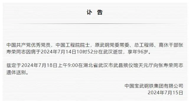 根據(jù)中國寶武鋼鐵集團有限公司消息,中國共產(chǎn)黨優(yōu)秀黨員,中國工程院院士,原武鋼黨委常委、總工程師、離休干部張壽榮同志因病于2024年7月14日10時52分在武漢逝世,享年96歲。
