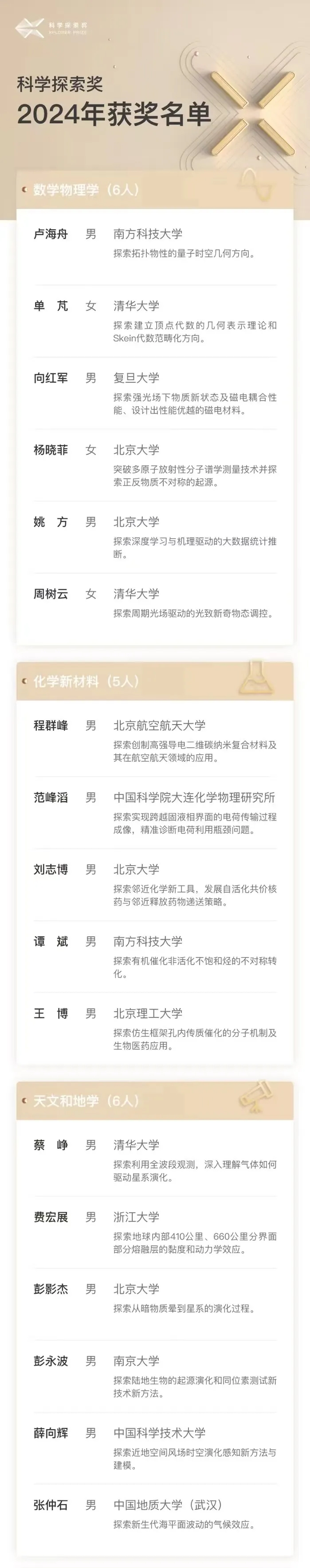 2024年“科學探索獎”設(shè)置10個領(lǐng)域,包括數(shù)學物理學、化學新材料、天文和地學、生命科學、醫(yī)學科學、信息電子、能源環(huán)境、先進制造、交通建筑、前沿交叉。每位獲獎人在5年內(nèi)獲得總計300萬元人民幣獎金,且可自由支配。