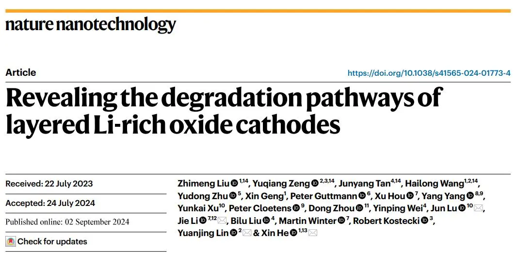近日,四川大學(xué)化學(xué)工程學(xué)院何欣研究員團(tuán)隊(duì)在國際期刊Nature Nanotechnology上發(fā)表題為Revealing the degradation pathways of layered Li-rich oxide cathodes的研究文章。通過整合形貌、結(jié)構(gòu)和從單個原子的氧化態(tài)演化到次級顆粒的分析,經(jīng)過納米尺度到微尺度的表征,確定了與顆粒內(nèi)非相反應(yīng)相關(guān)的不同結(jié)構(gòu)變化途徑。