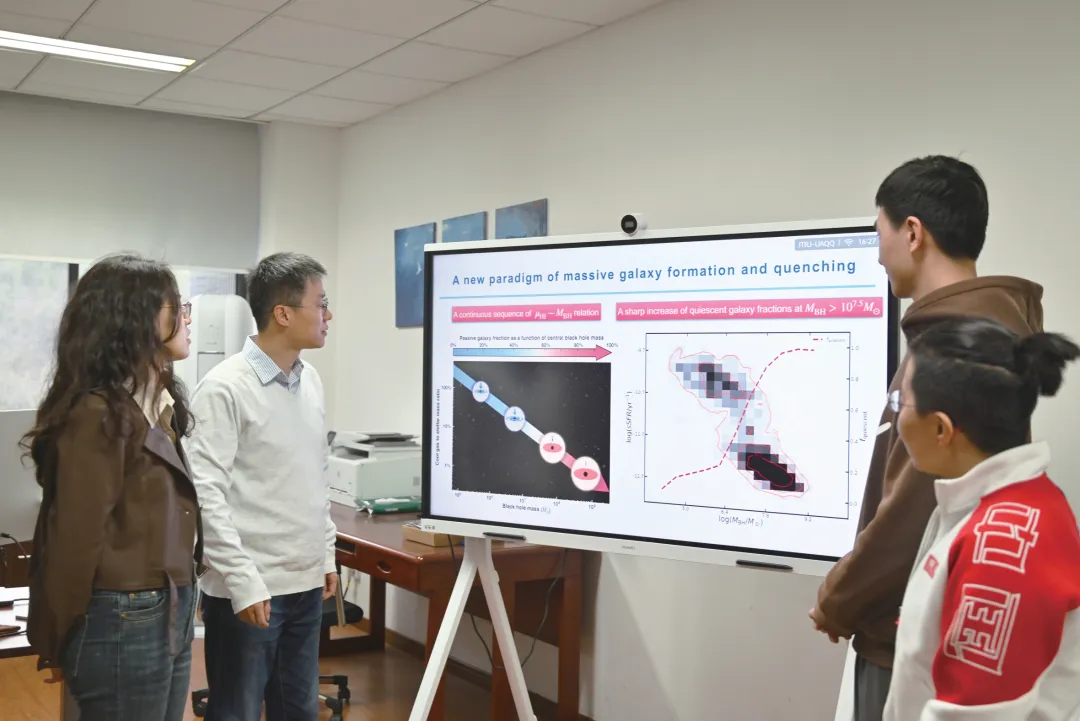 這個(gè)結(jié)論看似簡單,卻是幾代科學(xué)家半個(gè)世紀(jì)“接力”的結(jié)果。王濤表示,受制于傳統(tǒng)思維,此前科學(xué)家們主要聚焦黑洞最活躍的階段進(jìn)行研究,卻始終沒有發(fā)現(xiàn)明確證據(jù)。因此,團(tuán)隊(duì)轉(zhuǎn)變思路,從黑洞質(zhì)量角度重新出發(fā)探索答案,終于捕捉到黑洞與冷氣體的深層關(guān)聯(lián)。“我們的創(chuàng)新點(diǎn)在于,一是考慮到星系漫長的演化時(shí)標(biāo),我們相應(yīng)地去探索中心黑洞在長時(shí)標(biāo)上的活動性表征——黑洞質(zhì)量與星系冷氣體和恒星形成的關(guān)系;二是我們考慮到黑洞對冷氣體的影響可能更多地體現(xiàn)為氣體冷卻的直接產(chǎn)物——原子氫氣體,而不是形成機(jī)制更為復(fù)雜的分子氣體。因此朝著黑洞質(zhì)量與原子氣體之間的關(guān)系努力,結(jié)果證明這個(gè)方向是正確的。”