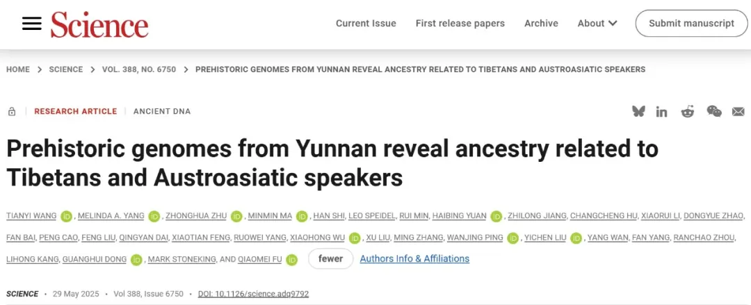 近日,四川大學考古文博學院、考古科學中心團隊與中國科學院古脊椎動物與古人類研究所付巧妹團隊等合作,系統(tǒng)研究了云南省17個遺址127例距今7100年以來的古人類基因組。該研究填補了該區(qū)域史前人群遺傳數據的空白,首次從遺傳學視角精準識別出青藏高原“幽靈祖先”成分,揭示出南亞語系人群遺傳起源及云南作為多元人群交流樞紐的關鍵作用。相關成果以“Prehistoric genomes from Yunnan reveal ancestry related to Tibetans and Austroasiatic speakers”為題發(fā)表在國際學術期刊《科學》(Science)。