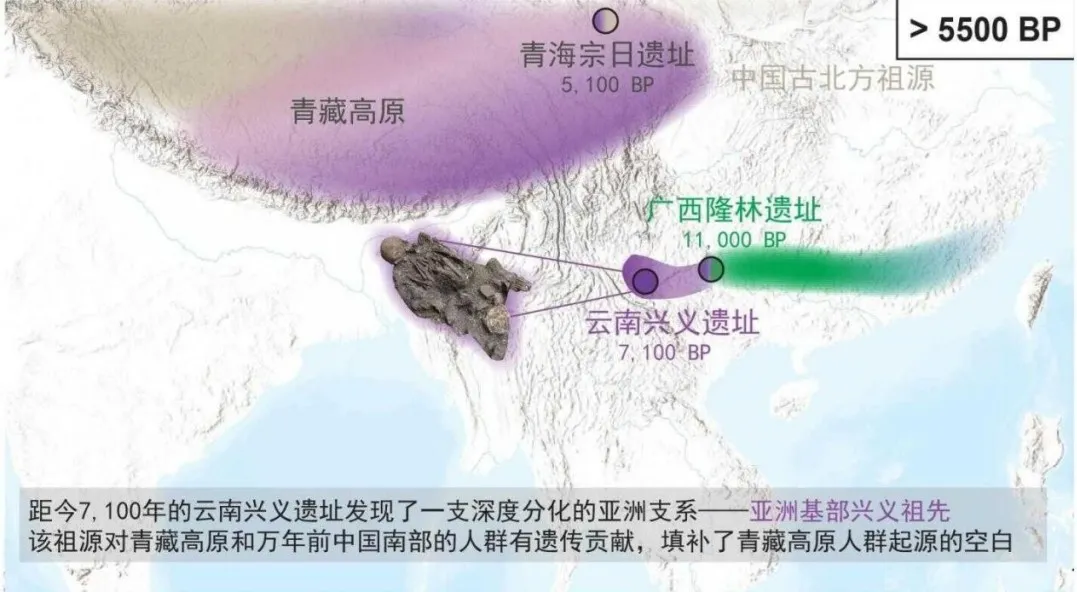 本研究的第一項突破是首次發(fā)現青藏高原“幽靈祖先”。青藏高原人群遺傳結構一直備受學界關注。根據此前研究成果,距今5100年前至今,青藏高原人群遺傳成分中約80%源自9500-4000年前的中國北方人群,其余20%來源不明,學界稱之為“幽靈祖先”。這一成分來源一直未能確定,備受學界關注。本研究通過基因捕獲、測序,從云南興義遺址一名距今7100年前的個體(Xingyi_EN)基因組中識別出一種新的、深度分化的亞洲遺傳成分,研究團隊判定其為“亞洲基部興義祖先”(Basal Asian Xingyi Ancestry)。研究表明,這一遺傳成分不僅對古代青藏高原人群有遺傳貢獻,也廣泛存在于現代藏族人群基因組中,以Xingyi_EN為代表的古老人群正是學界關注但之前尚未精準定位的青藏高原“幽靈祖先”組成成分之一,為東亞人群遷徙、演化過程提供了新證據。