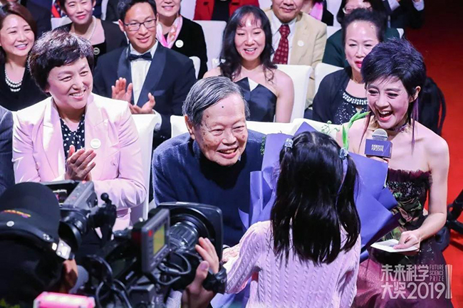 陳旭(左一)與楊振寧(左二)在頒獎(jiǎng)典禮現(xiàn)場(chǎng)