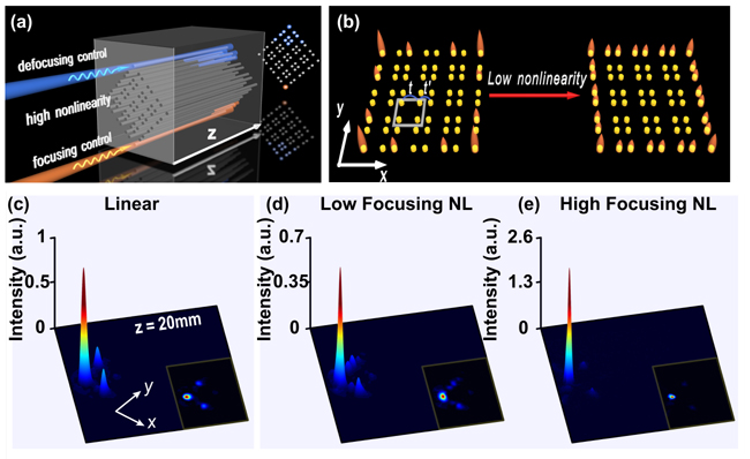 非線性調(diào)控連續(xù)譜中的高階拓?fù)鋺B(tài)。a-b分別為強(qiáng)非線性和弱非線性調(diào)控下的示意圖;c-e分別為線性拓?fù)浣菓B(tài)模式、弱自聚焦和強(qiáng)自聚焦非線性條件下的實(shí)驗(yàn)結(jié)果