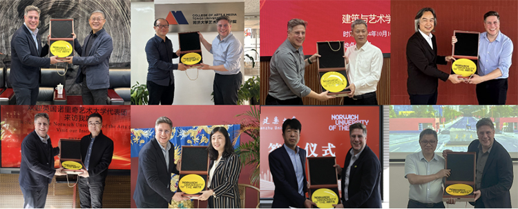 英國諾維奇藝術大學常務副校長斯托珀拜訪中國頂尖高校并交流探討創(chuàng)意藝術在研究和教學方面的合作,并與校方領導交換紀念品。