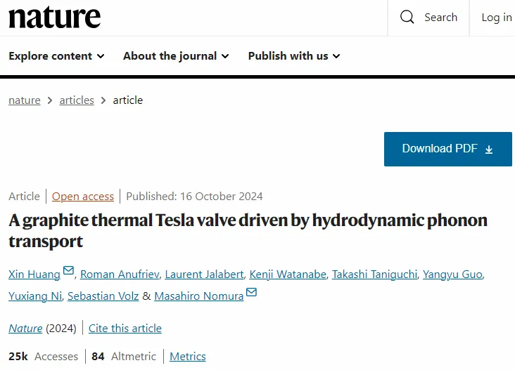 近日,國際頂級學術期刊Nature刊發(fā)西南交通大學物理科學與技術學院倪宇翔教授參與完成的科研成果“A graphite thermal Tesla valve driven by hydrodynamic phonon transport”。該成果是物理、材料等多學科的深度交叉融合,由倪宇翔教授、日本東京大學Masahiro Nomura教授團隊、哈爾濱工業(yè)大學郭洋裕教授等合作完成。