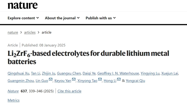 由于m-Li2ZrF6 納米顆粒的合成工藝簡單,具備大規(guī)模生產條件,為鋰金屬電池的廣泛應用提供了解決方案。研究成果歷經(jīng)2年5個月的4輪審稿、修改,最終以“Li2ZrF6 basedelectrolytes for durable lithium metal batteries”(六氟鋯酸鋰基耐用型鋰金屬電池)為題發(fā)表在國際頂尖學術期刊Nature上。