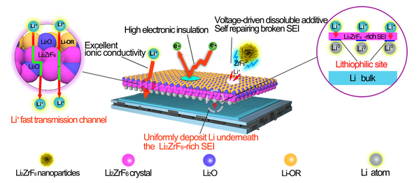針對以上難點,研究團隊基于理論計算,驗證了以t-Li2ZrF6晶體構建理想型固態(tài)電解質界面的可行性,首次提出用電場驅動m-Li2ZrF6轉化為t-Li2ZrF6來構筑固態(tài)電解質界面的策略。相關實驗表明,這一策略不僅能夠憑借優(yōu)異的電子絕緣性阻止電子擊穿固態(tài)電解質界面進而抑制電解液的分解,還能夠為Li+ 提供快速遷移的通道,提高鋰金屬電池的倍率性能。此外,t-Li2ZrF6晶體表面豐富的親鋰位點能夠和其內部的離子通道一起,誘導鋰金屬均勻沉積,抑制鋰枝晶的生長,從而提高鋰金屬電池的安全性。同時,過量m-Li2ZrF6添加劑不僅能夠改善傳統(tǒng)添加劑在循環(huán)中被耗盡的缺陷,還能夠通過ZrF62-離子及時修復破損的固態(tài)電解質界面,為鋰金屬負極的界面穩(wěn)定性提供長期保護。