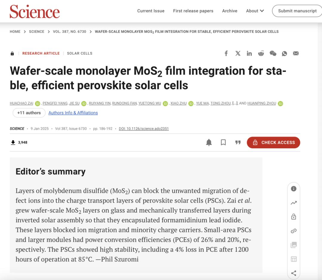 1月9日,北京大學周歡萍教授、張艷鋒教授(共同通訊作者)在Science上發(fā)表了題為“Wafer-scale monolayer MoS2 film integration for stable, efficient perovskite solar cells”(晶圓級單層MoS2薄膜集成實現穩(wěn)定、高效的鈣鈦礦太陽能電池)的研究論文。