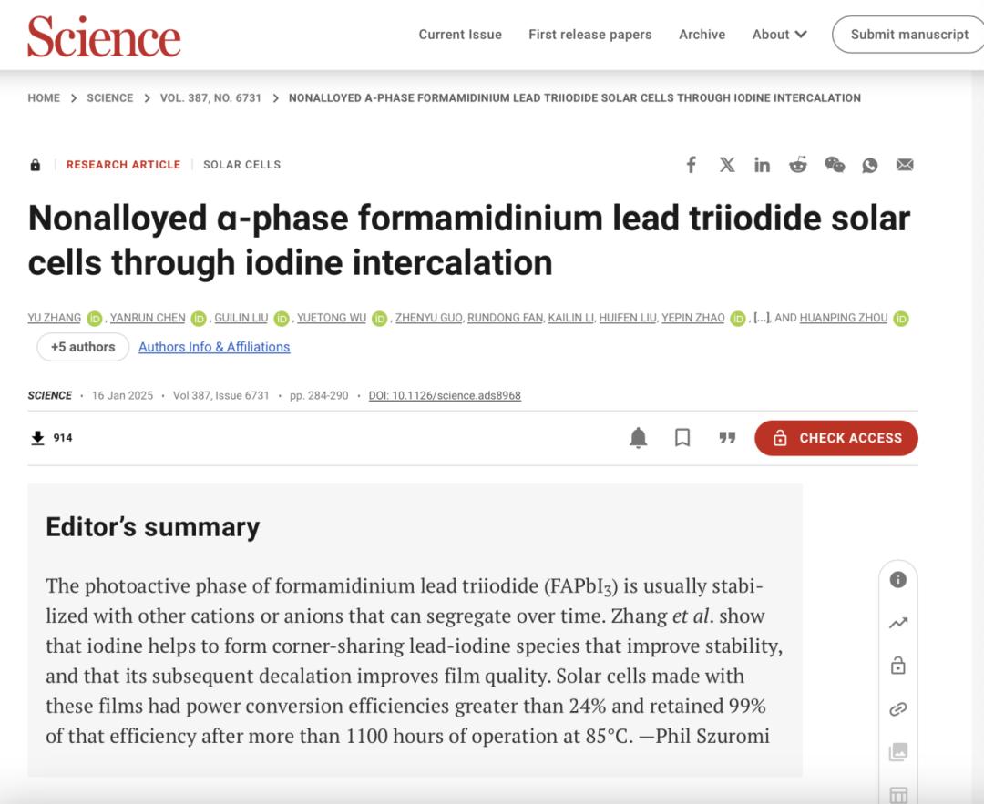 1月16日,周歡萍教授為獨立通訊作者,再度在Science發(fā)表了題為“Nonalloyed α-phase formamidinium lead triiodide solar cells through iodine intercalation”(通過碘嵌入制備非合金α-FAPbI3太陽能電池)的研究論文。這是Science期刊在一周之內連續(xù)兩次刊發(fā)周歡萍團隊在鈣鈦礦太陽能電池領域的研究進展。