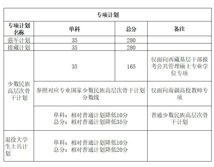 符合條件并申請(qǐng)享受少數(shù)民族照顧政策的考生(指工作單位和戶籍在國務(wù)院公布的民族區(qū)域自治地方,且定向就業(yè)單位為原單位的少數(shù)民族在職人員考生),總分相較報(bào)考專業(yè)普通計(jì)劃降10分,單科不變。