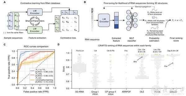 圖2:CRAFTS的性能評估,分析RNA家族結(jié)構(gòu)特征。A. 對比學(xué)習(xí)用于確定輸入對是否屬于同一RNA家族。 B. 微調(diào)模型以從每個RNA家族的序列中提取結(jié)構(gòu)特征。 C基準數(shù)據(jù)性能表現(xiàn):平均ROC曲線及標準差(基于5折交叉驗證)。D. 對5S rRNA、I類內(nèi)含子、CP II類內(nèi)含子等家族分析。通過實驗結(jié)構(gòu)測定驗證的序列以橙色標注。
