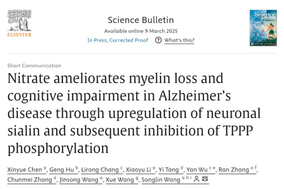 近日,首都醫(yī)科大學(xué)基礎(chǔ)醫(yī)學(xué)院口腔健康北京實(shí)驗(yàn)室王松靈院士團(tuán)隊(duì)在《Science Bulletin》上發(fā)表題為“Nitrate ameliorates myelin loss and cognitive impairment in Alzheimer's disease through upregulation of neuronal sialin and subsequent inhibition of TPPP phosphorylation”的研究論文。該研究發(fā)現(xiàn)硝酸鹽顯著緩解阿爾茨海默病(AD)模型小鼠髓鞘丟失并有效改善其認(rèn)知障礙,并揭示硝酸鹽上調(diào)神經(jīng)元硝酸鹽轉(zhuǎn)運(yùn)蛋白(Sialin),進(jìn)一步降低AD模型小鼠海馬促微管蛋白聚合蛋白(TPPP)的磷酸化是其緩解AD的機(jī)制,該研究為AD治療靶點(diǎn)和治療策略的開發(fā)提供重要理論依據(jù)。首都醫(yī)科大學(xué)基礎(chǔ)醫(yī)學(xué)院口腔健康北京實(shí)驗(yàn)室博士后陳欣月為第一作者,王松靈院士為通訊作者。