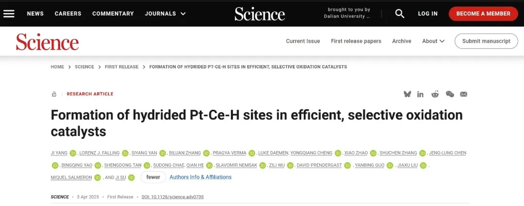 近日,大連理工大學(xué)化工學(xué)院劉家旭教授團(tuán)隊(duì)與勞倫斯伯克利國(guó)家實(shí)驗(yàn)室Ji Su研究員、Miquel Salmeron教授、David Prendergast研究員課題組及華中師范大學(xué)郭彥炳教授課題組合作在負(fù)載型催化劑研制方面取得突破性進(jìn)展,研究成果“Pt-Ce催化劑中氫化位點(diǎn)的形成驅(qū)動(dòng)高效選擇性氧化”(Formation of hydrided Pt-Ce-H sites in efficient, selective oxidation catalysts)在《科學(xué)》(Science)上發(fā)表。該研究表明在設(shè)計(jì)高效負(fù)載型催化劑時(shí),需要精確構(gòu)建金屬與載體之間的界面結(jié)構(gòu),并充分利用氫在催化過(guò)程中的獨(dú)特作用。劉家旭教授為通訊作者之一,團(tuán)隊(duì)科研助理閆思楊工程師為共同第一作者。