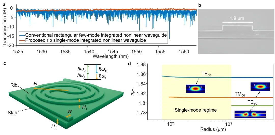 基于以上重大挑戰(zhàn),趙平團隊提出基于“脊形減模+彎曲濾?!奔夹g(shù)的單模、負色散非線性集成光波導(dǎo)設(shè)計普適性方法,原理上消除了過往參量放大非線性多模集成光波導(dǎo)中的隨機模式串擾。團隊以超低損耗非線性氮化硅集成平臺為例,制備出具有平坦傳輸光譜的、單模負色散非線性集成光波導(dǎo)芯片,如圖1所示。團隊還進一步發(fā)展了非線性氮化硅集成光波導(dǎo)中模電模式基模(TE00)二階與四階色散精確協(xié)同調(diào)控技術(shù),實驗中實現(xiàn)了帶寬高達330nm的片上光參量放大,如圖2所示。該項研究為新一代超大帶寬光放大提供了新思路,在提升光纖/無線光通信容量,擴大數(shù)據(jù)中心光互連規(guī)模,提高光學(xué)測量精度,拓展光譜檢測分析范圍等方面有良好的應(yīng)用潛力。