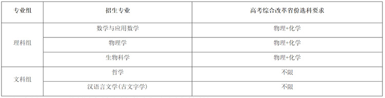 服務(wù)國(guó)家重大戰(zhàn)略需求的基礎(chǔ)理科學(xué)科以及國(guó)家人才緊缺的社會(huì)科學(xué)與人文學(xué)科領(lǐng)域,招生專業(yè)、選考科目、科類要求及招生計(jì)劃見下表: