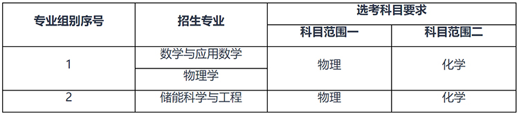 我校強(qiáng)基計(jì)劃招生專業(yè)為數(shù)學(xué)與應(yīng)用數(shù)學(xué)、物理學(xué)、儲能科學(xué)與工程,設(shè)置為兩個(gè)專業(yè)組別。