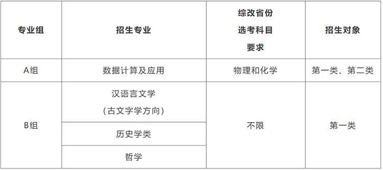 我校強(qiáng)基計劃招生專業(yè)為數(shù)據(jù)計算及應(yīng)用、漢語言文學(xué)(古文字學(xué)方向)、歷史學(xué)類、哲學(xué)??忌傻卿泩竺到y(tǒng)查看我校2025年分省(區(qū)、市)強(qiáng)基計劃招生專業(yè)及招生計劃;第二類考生單列計劃。