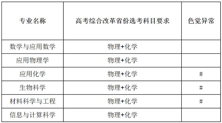 2.對考生身體健康狀況的要求執(zhí)行教育部、原衛(wèi)生部、中國殘疾人聯(lián)合會制定并下發(fā)的《普通高等學(xué)校招生體檢工作指導(dǎo)意見》中的規(guī)定。標(biāo)記“#”的專業(yè)不招收相關(guān)色覺異常(色盲、色弱、單色不能識別)考生。