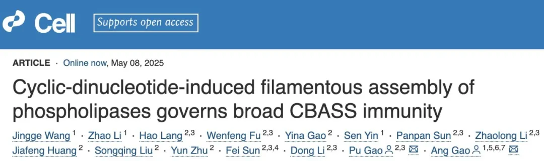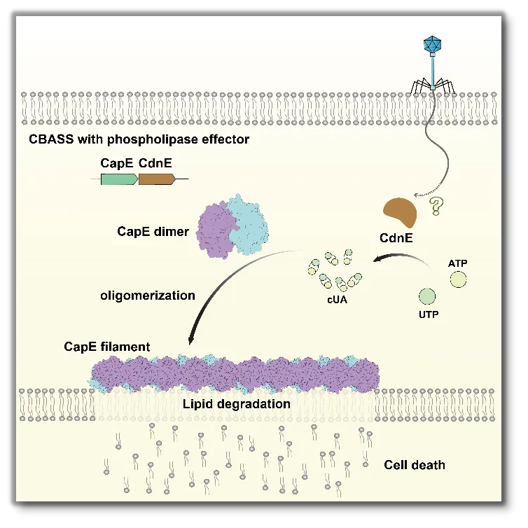 文章題為Cyclic dinucleotide-induced filamentous assembly of phospholipases governs broad CBASS immunity,揭示了CBASS系統(tǒng)磷脂酶類(lèi)效應(yīng)蛋白在響應(yīng)環(huán)狀寡核苷酸分子后,自組裝形成超分子纖維結(jié)構(gòu),進(jìn)而降解細(xì)菌內(nèi)膜完成細(xì)胞殺傷的分子機(jī)制。這一發(fā)現(xiàn)不僅拓展了細(xì)菌免疫應(yīng)答的多樣性,也為開(kāi)發(fā)新型抗病毒策略和可控細(xì)胞裂解工具提供了理論依據(jù)。
