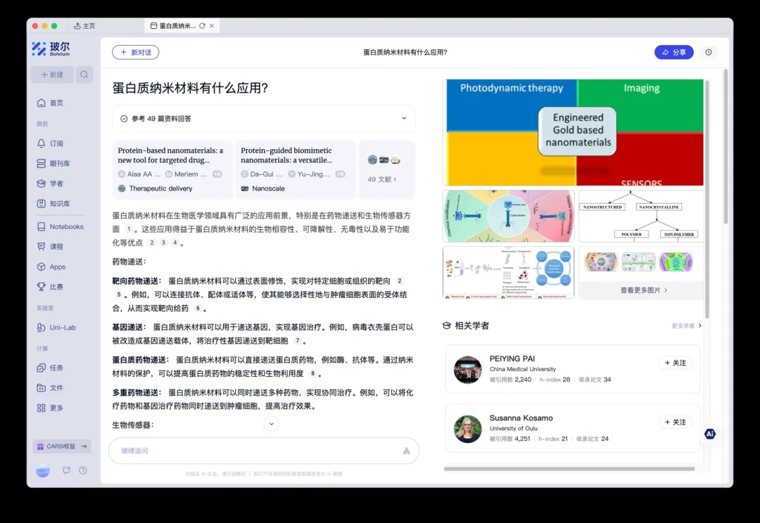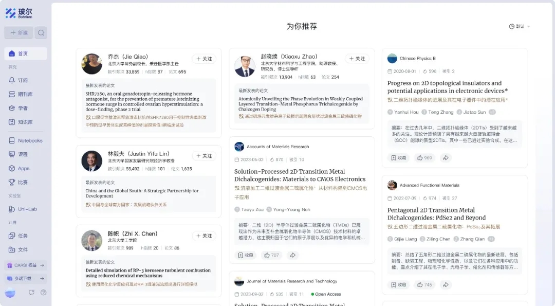作為專屬北大科研社區(qū)的平臺(tái),「科學(xué)導(dǎo)航」優(yōu)先對接校內(nèi)數(shù)據(jù)平臺(tái)與知識(shí)庫,加速本??蒲谐晒麖?fù)用。例如搜索結(jié)果中會(huì)優(yōu)先展示北大團(tuán)隊(duì)近年發(fā)表的高被引論文,并智能推薦相關(guān)領(lǐng)域的校內(nèi)學(xué)者及其課題組信息,幫助師生快速建立學(xué)術(shù)聯(lián)系。這種“以需求為中心”的設(shè)計(jì)理念,消除了信息獲取壁壘,讓科研人員無需在多個(gè)系統(tǒng)間切換,全身心投入創(chuàng)新工作。