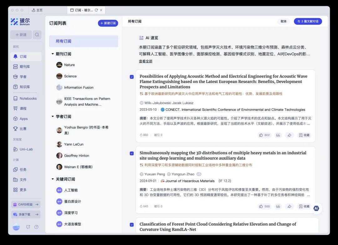 平臺(tái)提供多維度實(shí)時(shí)訂閱功能,支持按關(guān)鍵詞、期刊、學(xué)者、機(jī)構(gòu)等單一或組合維度定制追蹤方案,動(dòng)態(tài)聚合最新科研成果(如“人工智能+醫(yī)療”“基因編輯”等熱點(diǎn)領(lǐng)域的論文與學(xué)者動(dòng)態(tài))。智能知識(shí)庫則實(shí)現(xiàn)科研數(shù)據(jù)的全流程管理:支持論文、專利、筆記、AI對話等多模態(tài)數(shù)據(jù)統(tǒng)一存儲(chǔ),集成“智能科研閱讀器”輔助深度閱讀(含AI問答、智能翻譯、筆記標(biāo)注功能),采用分布式存儲(chǔ)架構(gòu)與元數(shù)據(jù)自動(dòng)標(biāo)注技術(shù),配合樹狀文件夾管理與自動(dòng)化標(biāo)簽系統(tǒng),可批量處理文獻(xiàn)問答,數(shù)據(jù)處理效率較傳統(tǒng)模式大幅提升。